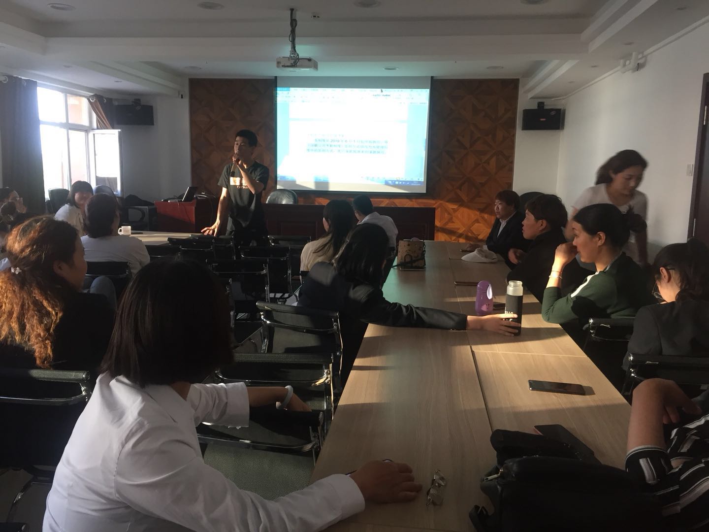培訓(xùn)開始時,主持人用簡潔的語言為大家介紹了“釘釘軟件考勤管理制度”包括使用原則考勤要求、考勤方式。