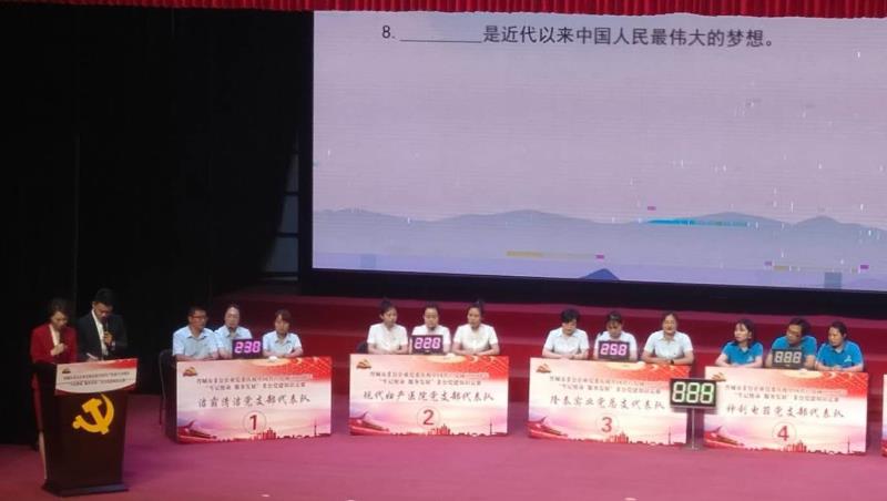 不忘初心跟黨走,牢記使命譜華章!為了慶祝中國共產(chǎn)黨成立99周年,6月28日下午,晉城市非公企業(yè)黨委在澤州天泰錦辰煤業(yè)有限公司職工文化宮進(jìn)行了一場別開生面的“牢記使命 服務(wù)發(fā)展”黨建知識競賽。潔霸清潔黨支部、現(xiàn)代婦產(chǎn)醫(yī)院黨支部、隆泰實業(yè)黨總支、神利電器黨支部、眾宸工貿(mào)黨支部和蔬菜公司黨支部等六支代表隊在此激戰(zhàn)正酣,各代表隊你追我趕,斗志昂揚,不甘落后,力爭上游,最終,我公司支部代表隊榮獲比賽三等獎。
