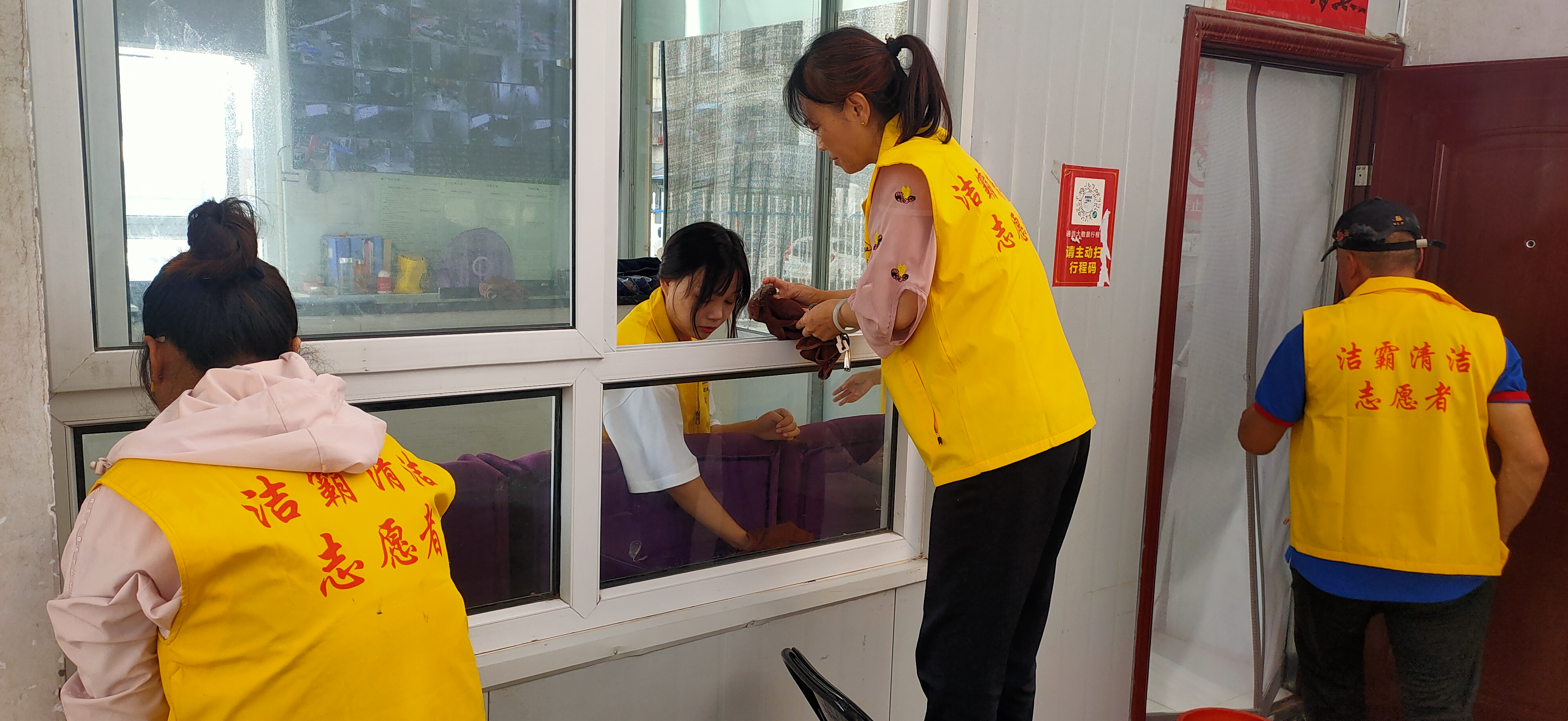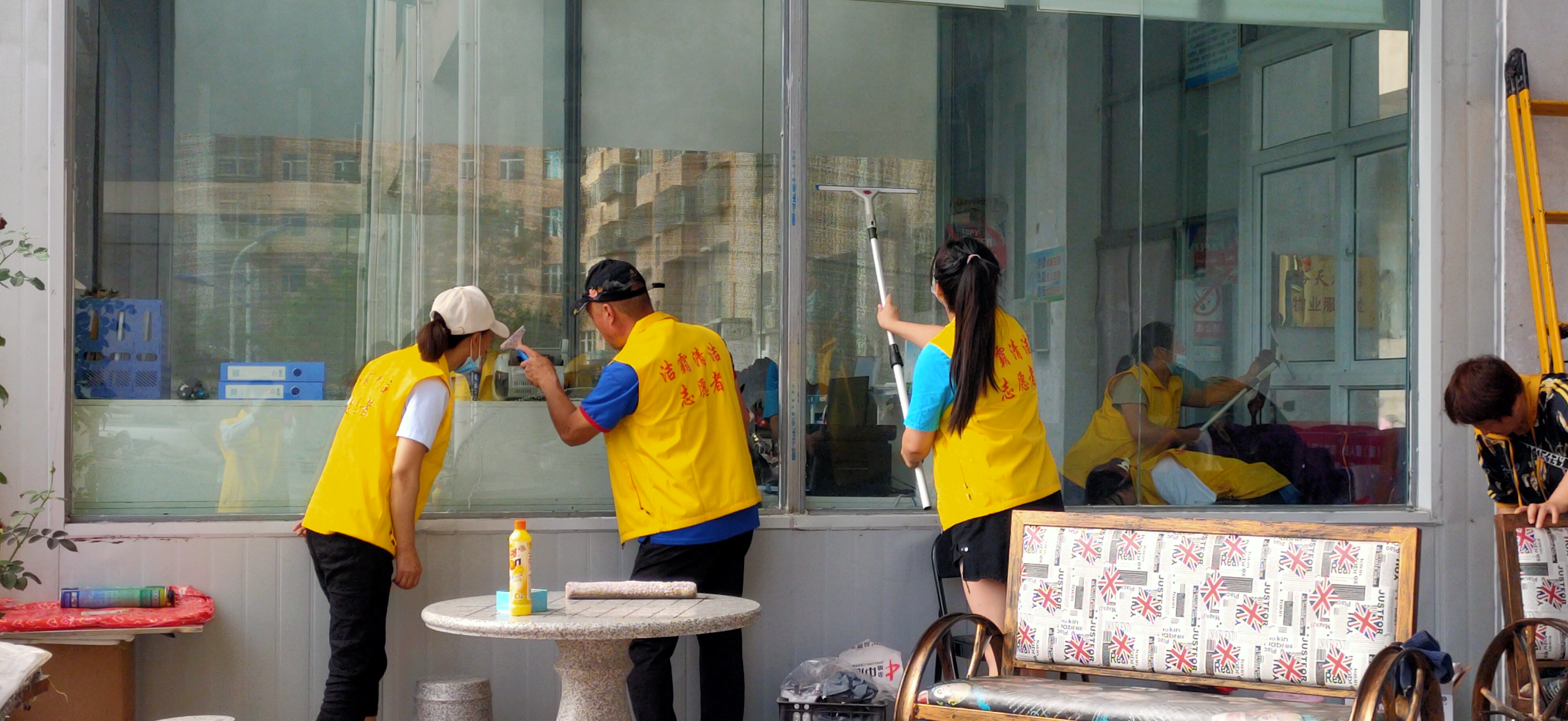 活動(dòng)現(xiàn)場(chǎng),志愿者身穿黃色馬甲,自帶玻璃擦、毛巾、笤帚、簸箕等清潔工具,對(duì)小區(qū)物業(yè)服務(wù)處及小區(qū)環(huán)境進(jìn)行清潔打掃。他們有的清掃小區(qū)天臺(tái)上的垃圾;有的清理樓道門及公共設(shè)施上的牛皮癬;有的擦拭門衛(wèi)的玻璃;有的清洗紗窗;有的清洗物業(yè)服務(wù)處的玻璃幕墻……志愿者個(gè)個(gè)干勁十足,不怕臟、不怕累,經(jīng)過一個(gè)多小時(shí)的團(tuán)結(jié)協(xié)作,小區(qū)環(huán)境煥然一新。