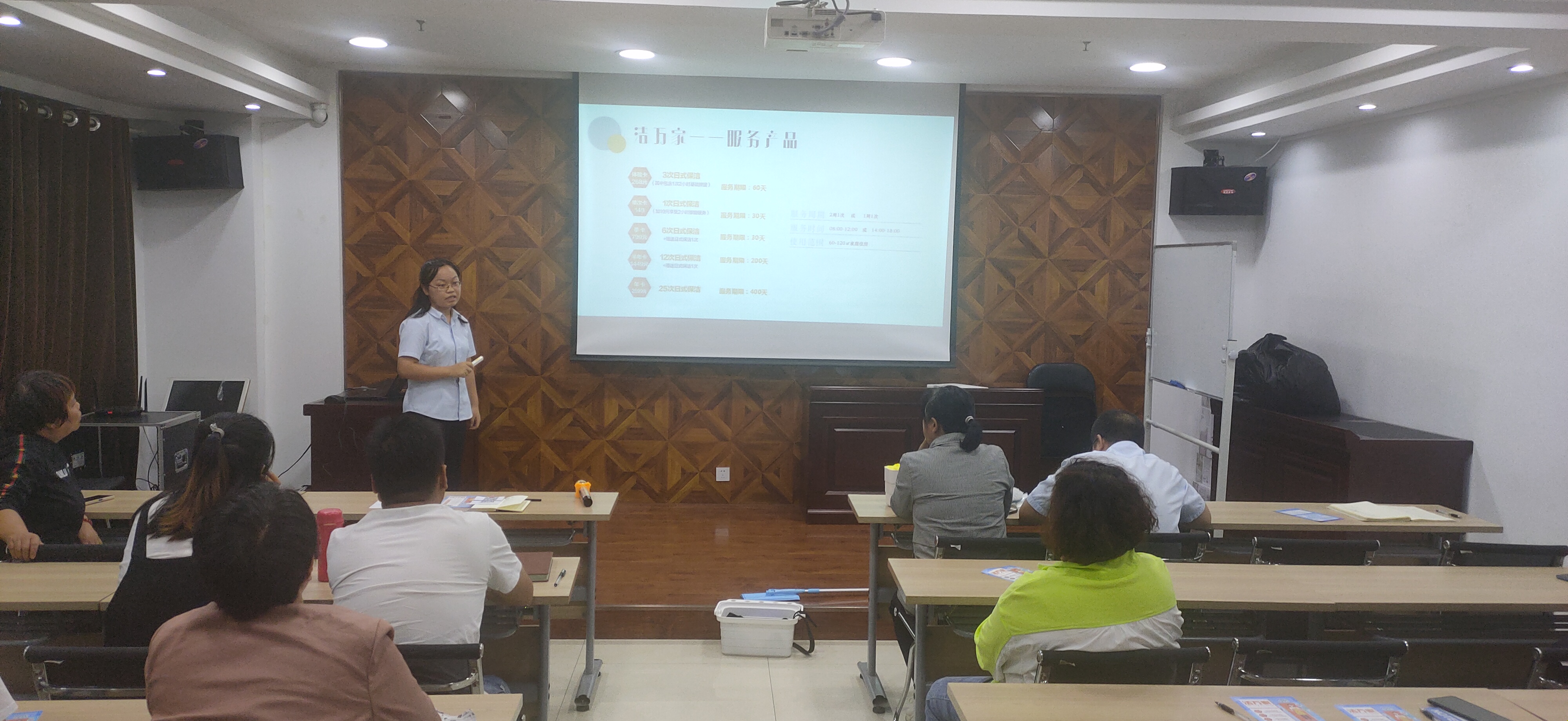 隨后由公司人力資源部負責(zé)人司夢琴對“潔萬家”日常保潔產(chǎn)品進行了分類介紹,此外還介紹了產(chǎn)品推廣獎勵方案和推廣話術(shù),對大家日后推廣過程中會遇到的客戶提出的各種問題進行了預(yù)設(shè)并一一詳細作答。