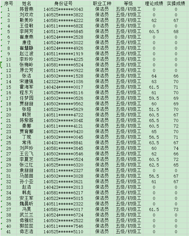 晉城市潔霸清潔服務(wù)股份有限公司職業(yè)技能等級認(rèn)定中心現(xiàn)將2024年8月4日認(rèn)定人員成績公示如下: