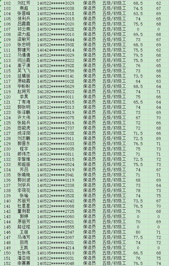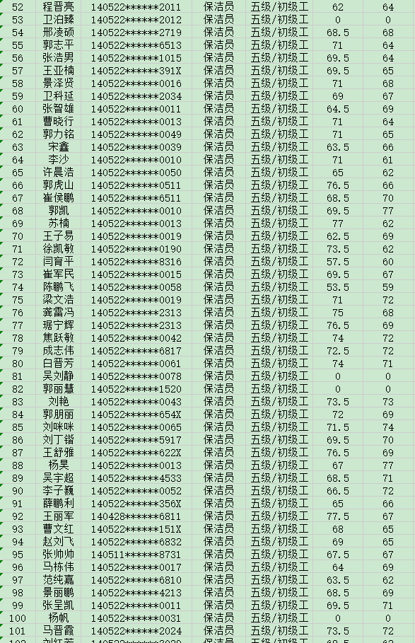 晉城市潔霸清潔服務(wù)股份有限公司職業(yè)技能等級認(rèn)定中心現(xiàn)將2024年8月17日認(rèn)定人員成績公示如下: