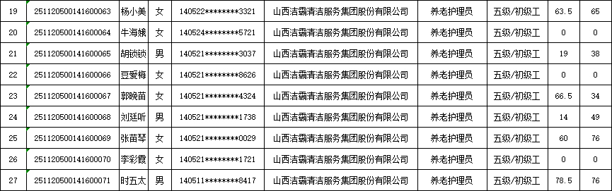 山西潔霸清潔服務(wù)集團(tuán)股份有限公司職業(yè)技能等級(jí)認(rèn)定中心2025年11月23日第5批養(yǎng)老護(hù)理員初級(jí)認(rèn)定人員成績(jī)公示